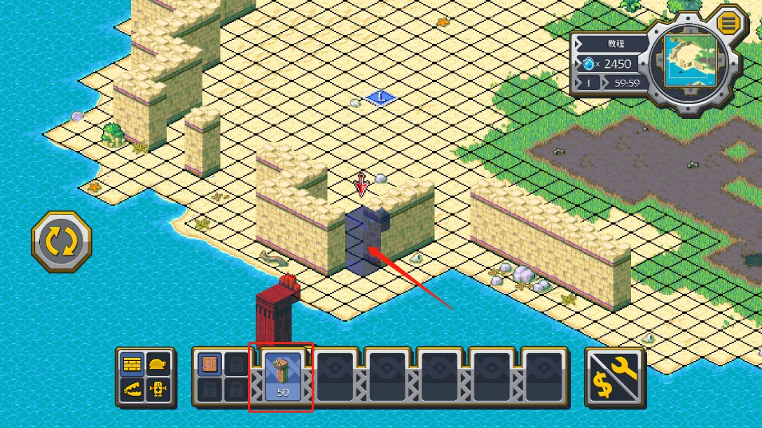 2、建造防御工事:在十二张独特地图上部署炮塔陷阱和特殊攻击来抵御敌人,还能修筑围墙等构筑物,点击左方按钮可旋转围墙,放错可点击右下方按钮售卖。