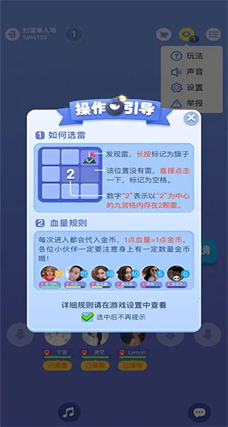 **战斗模式多样**,最多支持5人在线PK,还有6种难度可解锁。游戏中的标记和挖掘操作简便,数字与雷的关联逻辑清晰。而且它有独特的血量和金币设定,增加了游戏的策略性。玩家还能通过分析其他玩家水平,采用升阶或降阶打法,甚至不插旗迷惑对手,防止被平分,整体趣味性十足,值得一玩。