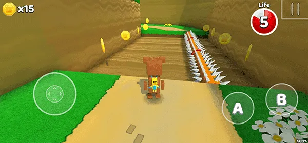 玩法超多样,挂机就能获取资源解锁新区域,还能参与刺激战斗。操作也不难,左下角轮盘控制移动,右侧屏幕滑动旋转视角,A跳跃,B攻击。沿路能拾取金币,遇到高处连点两次A可跳上去,长陷阱坑按特定操作能飞跃,靠近树叶藤蔓可向上爬,在水里能潜行。每个关卡有危险也有回血爱心图标。家园里还有小动物能聊天、购买道具。
