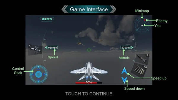 1、驾驶战斗机与敌机展开激烈空战,击落敌机赢取战役胜利。