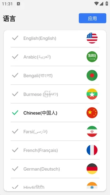 1、打开软件后,选择一个语言,点应用。