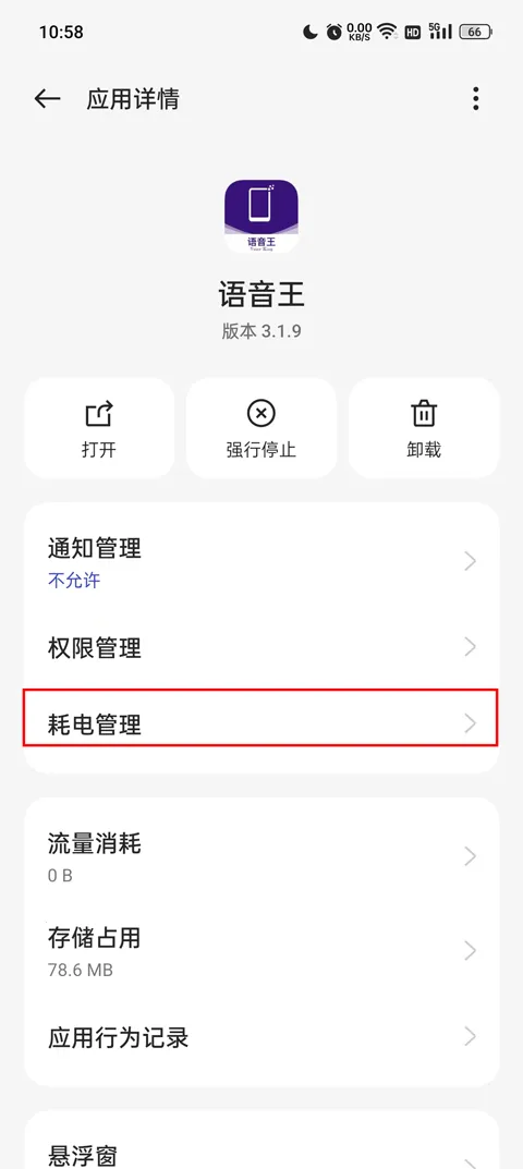 2、进入电池优化设置,在应用详情页中选择“耗电管理”;