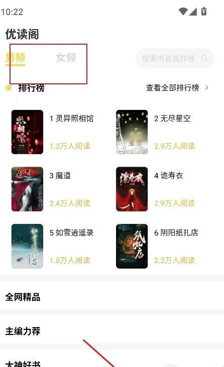1、进入【书城】界面,可以查看男频,或者女频小说资源