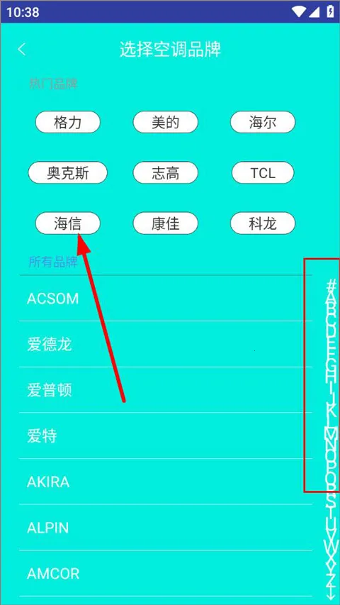 2、进入家电品牌页面,可以看到有格力、美的、海尔、志高等家电品牌,选择需要配对的家电品牌(也可按照家电拼音字母选择);