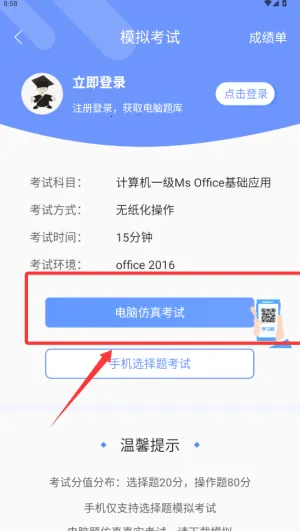 2. 下载安装后,选择对应考试类别和等级,进入主界面自由练习或模拟考试。